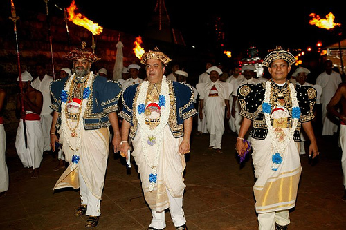 Right: A lithograph from 1841 showing traditional Nilames walking in the Kandy Perehera. This is in stark contrast to some modern Nilames who organize pageants to give the impression that the pagent is being held to honour them rather than the relic, and now even walk under umbrellas which were previously carried in the procession to honour the relics.