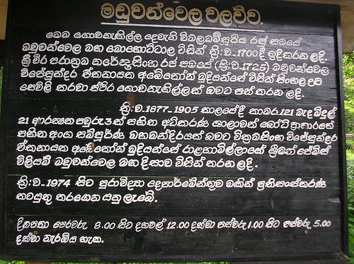 Right: a stone plaque placed at the walauwwa by the Archaeological Department attempting to give an ancient date for this building. Click here for a larger image of the plaque and note the number of grammatical errors made by this Commissioner General of archaeology in addition to his errors on history.