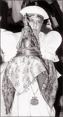 Click here for an example of a modern Nilame wearing shoes and gold jewelry and walking under an umbrella in the August 2008 Kandy perehera. In the past, these ceremonial umbrellas were carried in Kandy pageants solely to honour the holy relics. Not for the glory of Nilames.