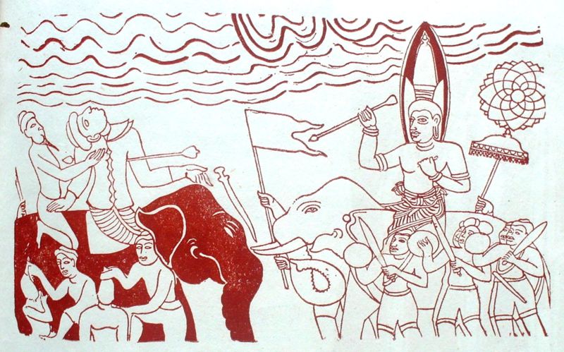 Right: The mural from Dambulla depicting the battle between Elara & Dutugemunu. The illustration is from Paranavitana's Sinhalayo. Note that Dutugemunu's banner has nothing on it. This is a small and subsidiary mural and such details are not to be expected.
